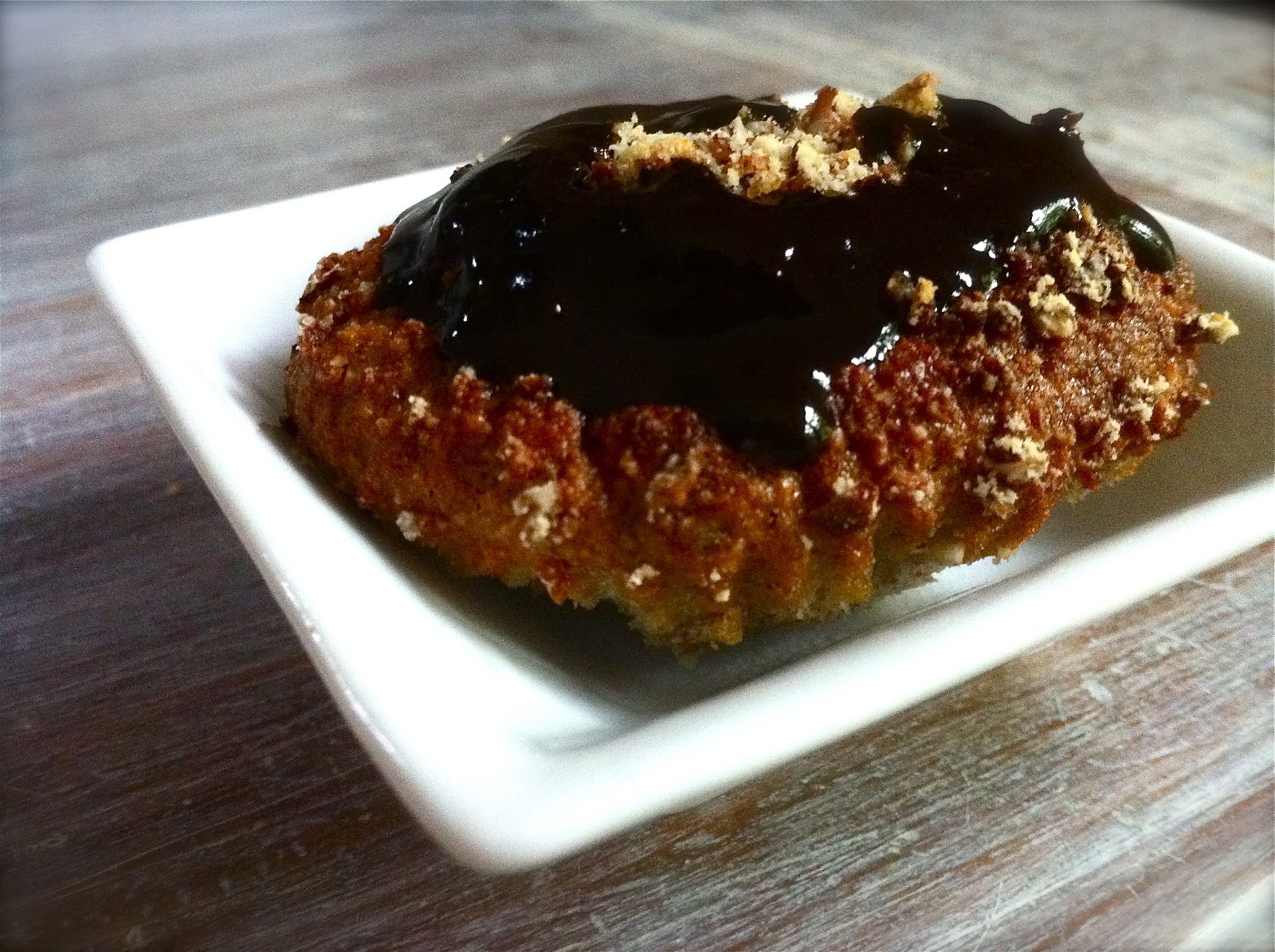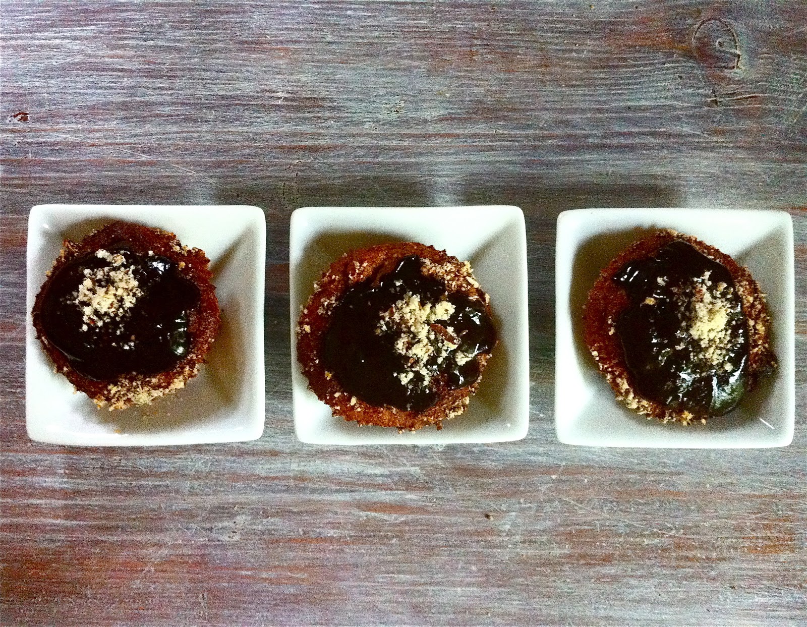 Polej babeczki ciemną czekoladą i posyp mielonymi migdałami.