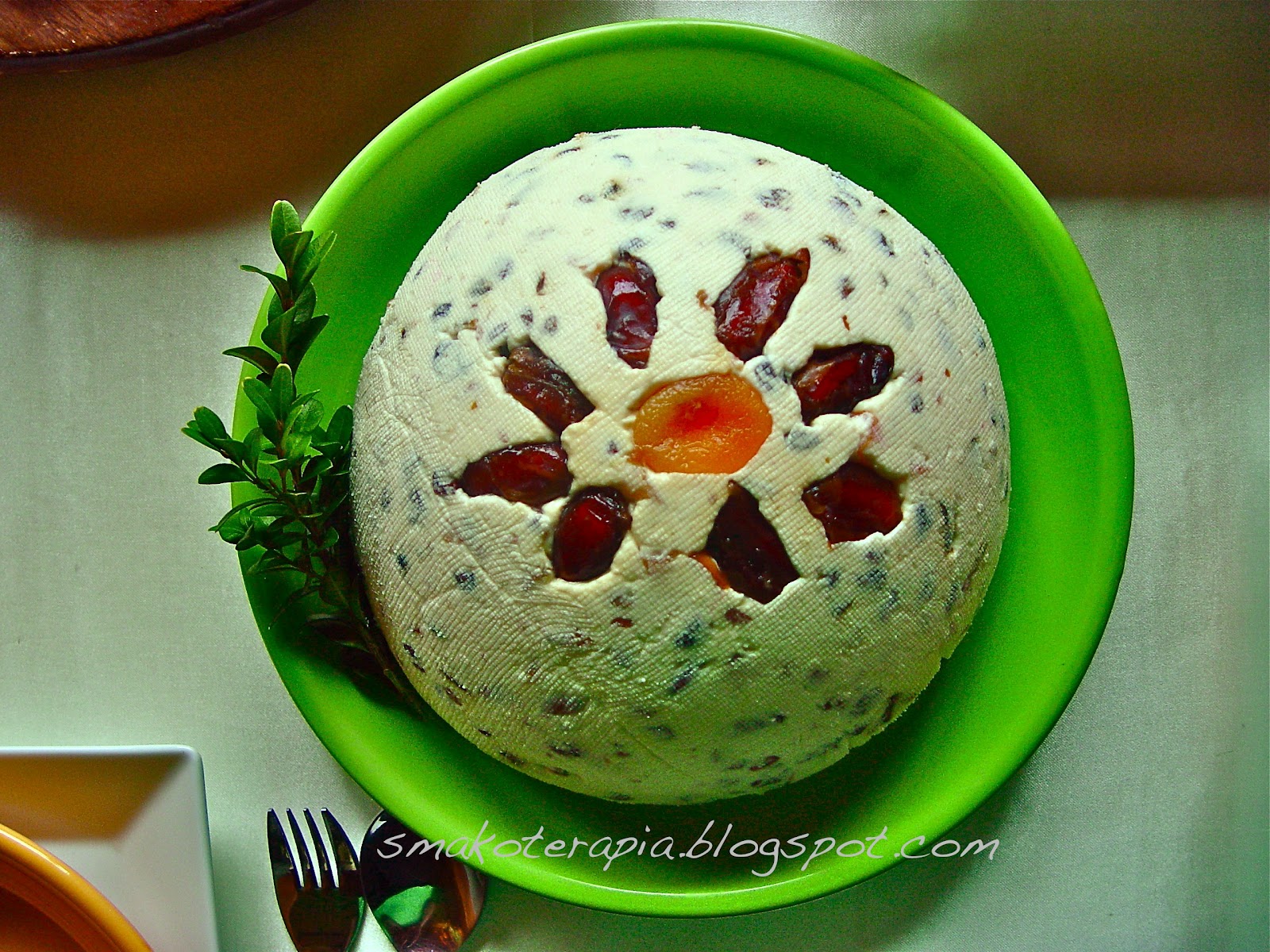 Ser zmiksować z masłem, cukrem (do smaku) i wanilią na gładką masę (jeśli ser jest bardzo suchy można dodać odrobinkę wody). Wrzucić bakalie. Całość przełożyć do misy wyścielonej gazą i ozdobami z bakalii, nastepnie włożyć na zamrażarki.