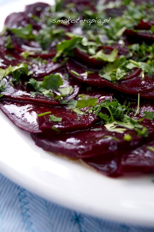 Buraki wyszoruj, nie obieraj, upiecz w piekarniku w temperaturze 170 stopni, w szklanym naczyniu z przykrywką (lub w folii aluminiowej, ja nie używam ze względu na aluminium). Po 30-45 minutach (polecam nie piec do miękkości) lub wtedy kiedy uznasz buraczki za zjadliwe dla Ciebie, wyjmij je, po chwili stygnięcia obierz, pokrój w cieniutkie pasterki i rozłóż na talerzu jak carpaccio. Polej całość octem i oliwą, posyp suto poszatkowaną kolendrą i podawaj.