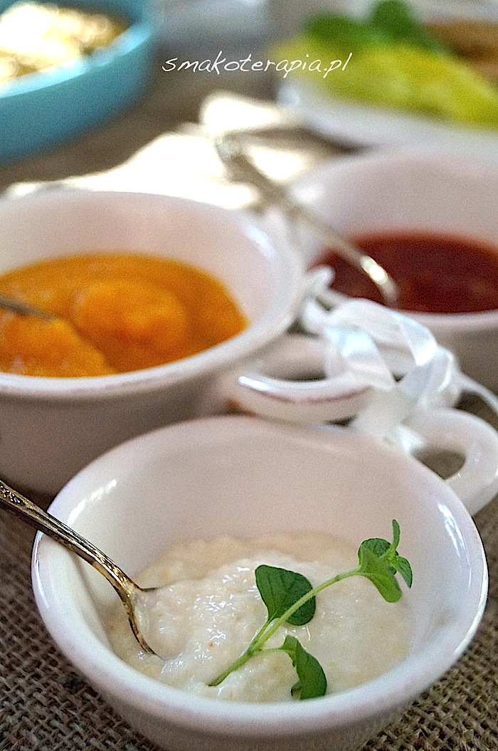 *chrzanowy (tarty chrzan, cytryna, sól, słód z agawy, „śmietana roślinna” (np słonecznikowa -> bury odcień, migdałowa -> odcień kremowy) zrobiona z miksowanych ziaren z dodatkiem wody