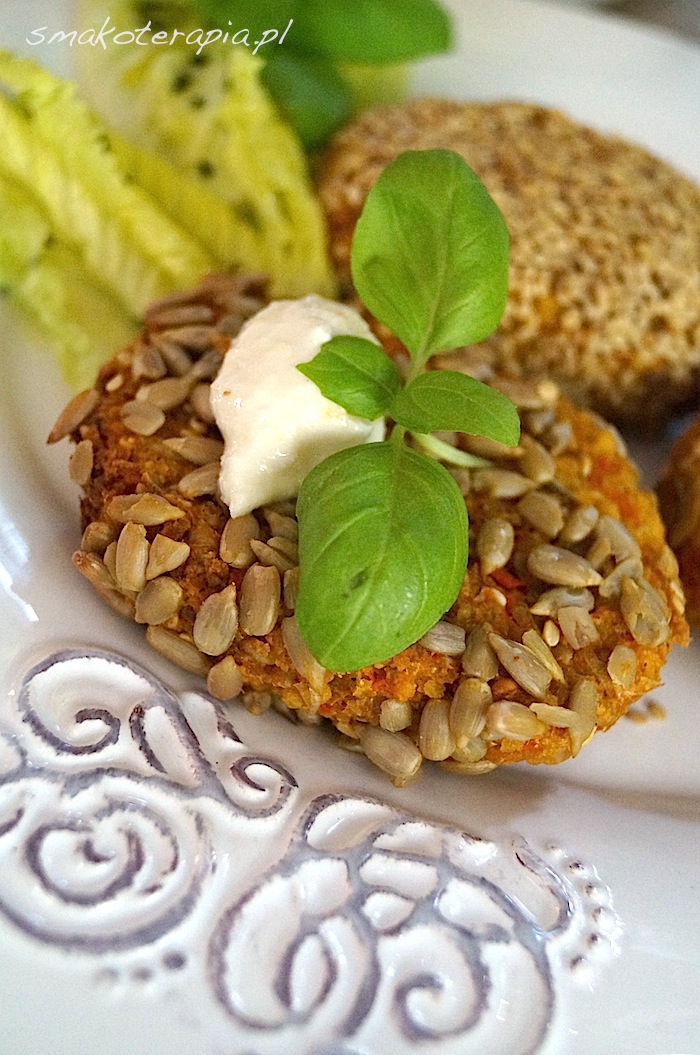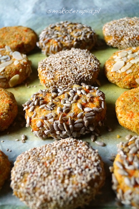 Podpraż na suchej patelni sezam (uwaga, łatwo się pali i gorzknieje!), tak samo postępuj ze słonecznikiem. Połowę podprażonego słonecznika, pestki dyni i len zmiel w wyciskarce ślimakowej albo zmiksuj dowolnym sprzętem domowym by je nieco rozdrobnić (niekoniecznie na mąkę). Marchew obierz (+ opcjonalnie, dodatkowe warzywa korzeniowe), zetrzyj na tarce bądź zmiel w wyciskarce i podpraż na patelni na półmiękko. Cebulę obierz, pokrój w bardzo drobną kosteczkę i podduś w niewielkiej ilości oleju. Teraz do miski wrzuć 2 szklanki ugotowanej kaszy, marchew i cebulę, dodaj zmielone pestki oraz len i porządnie wymieszaj całość. Obierz jabłko, wydrąż gniazda nasienne i zmiksuj na papkę. Dodaj do masy wraz olejem ponownie wymieszaj. Użyj stopki miksującej i zmiel nie więcej niż 1/5 masy dzięki czemu uzyskasz bardziej zwartą masę kotletów a jednocześnie zachowasz ziarnistą strukturę ingrediencji. Wymieszaj całość dorzucając sól i pieprz do smaku, zmiażdżony czosnek, kozieradkę i kumin (opcjonalnie), oraz pozostały podprażony słonecznik w całości. Teraz, po wymieszaniu i ocenie „stopnia słoności” możesz przejść do lepienia kotlecików lekko natłuszczonymi olejem dłońmi i panierowania ich. Część w sezamie, część w płatkach migdałów, część w słoneczniku. Znakomicie udają się również w wersji bez panierki. Wyłóż blaszkę lub ruszt papierem do pieczenia lekko nasmarowanym olejem, ułóż nań kotleciki i zapiekaj w piekarniku w temperaturze 180 stopni. Czas pieczenia zależy od Twoich preferencji co do chrupkości kotlecików (u nas ok. 1 godziny! 😉 ). Można je również w trakcie odwrócić na drugą stronę.