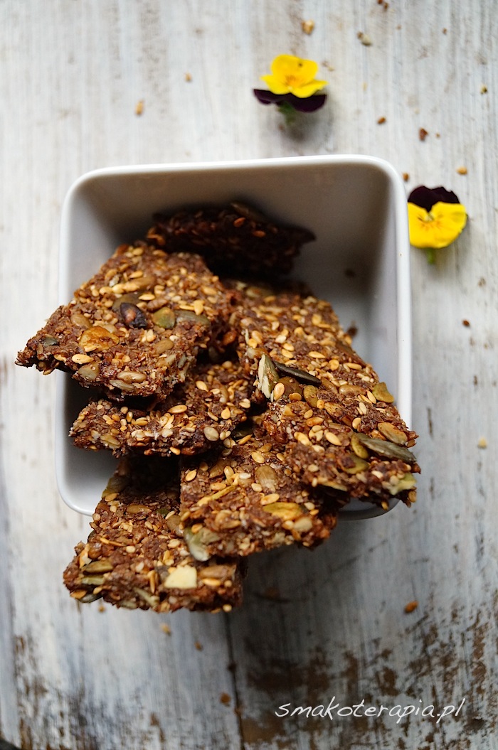 7. Rewelacja! Ale fakt, mogą być bardzo kruche. Ja trochę zmieniłam proporcje: 1 szklanka mielonego lnu, około pół szklanki oleju, 5-6 łyżek miodu i 3 szklanki sypkich składników (róznych). Na poczatku nie dało się to skleić w jedną, zwartą kulę, więc uznałam, że po upieczeniu będzie się rozpadać. Dodałam miodu i oleju, aż dało się skleić. Wychodzą boskie !!! Uzależnia! Dziś robię drugi rzut, pierwszy został skonsumowany na jedną kolację i jedno śniadanie. Myśle, że fajne by były z suszoną żurawiną – miły akcent kolorystyczny i trochę inny smak, niż ziaren.