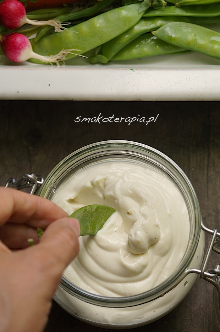 Pyszne, wyrwane przed chwilą z ziemi rzodkiewki, szczypiorek, świeże ogórki i kalafior, groszek cukrowy i musztardowiec oraz marchew chrupiemy maczając rzeczone w kremowym wegańskim majonezie. Jest beznabiałowy, bezcukrowy, bardzo delikatny w smaku, oparty tylko i wyłącznie na naturalnych składnikach, idealnie nadaje się również dla dzieci. W wersji „dla dorosłych” można podkręcić smak ulubionymi dodatkami: czosnkiem, ziołami, ostrą papryką…