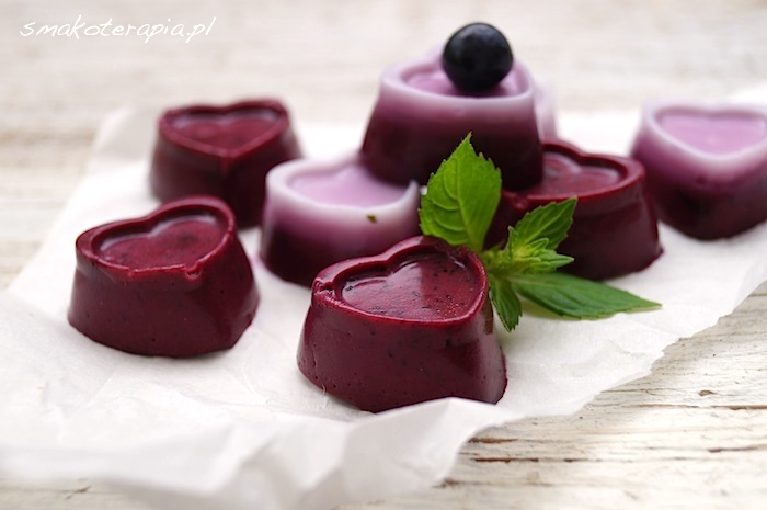 Mleko kokosowe wymieszaj z agarem i substancją słodzącą (najlepiej trzepaczką) i nieustająco mieszając gotuj około 5 minut. Wypełnij foremki na czekoladki białym płynem (max 1/3), niektóre pozostaw puste i odstaw by biała baza stężała (możesz wstawić na kilka minut do zamrażarki wówczas stężeją natychmiast!). W międzyczasie dodaj jeszcze jedną łyżeczkę agaru do chłodnego, pozostałego mleczka w garnku i wymieszaj dokładnie trzepaczką. I powtórka z rozrywki! Zagotuj nieustannie mieszając, po czym wrzuć do garnka sporą garść jagód, zmiksuj stopką i lekko przestudzone wlej na zastygnięte białe warstwy ptasich mleczek lub w osobne foremki (jednokolorowe ptaśki).