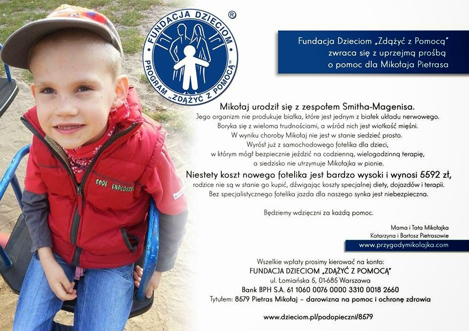 Rodziny które zmagają się, w dodatku bez skarg, z wyzwaniami rozwojowymi i zaburzeniami swoich dzieci to dla mnie prawdziwi herosi! Mikołaj ma wiele potrzeb ale też i zwyczajnych marzeń, wiele dziecięcych pragnien, które razem mozemy spełnić. 🙂 Dlatego wymyśliłam akcję Smako dla Miko! Przyłączycie się??? 😀 Liczy się każdy grosik… Akcja ma miejsce na fb. Zapraszam! Dodajcie do niej swoich znajomych i poślijcie dalej w świat! 🙂 KLIK!