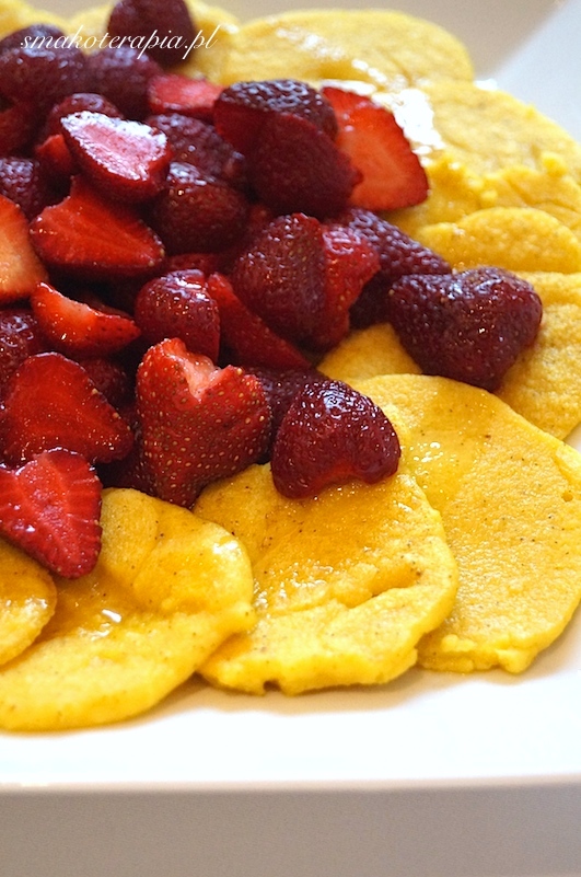 | Nieco inne, puchate placki jaglane z syropem klonowym i truskawkami |