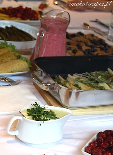 | Rzut oka na stół. Szparagi białe i zielone czekają na jaglany majonez i śmietanę migdałową z lubczykiem. |